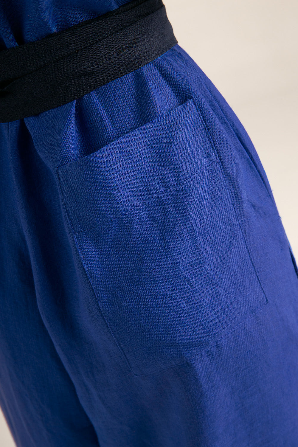 Enterizo largo en lino; cuello redondo, sin mangas; sistema de cierre en la espalda con botón en baño de oro; bota amplia; bolsillos laterales y un bolsillo de parche posterior; con cinturón independiente para amarrar y definir la cintura.. Color azul rey, Ref. 0A23A62