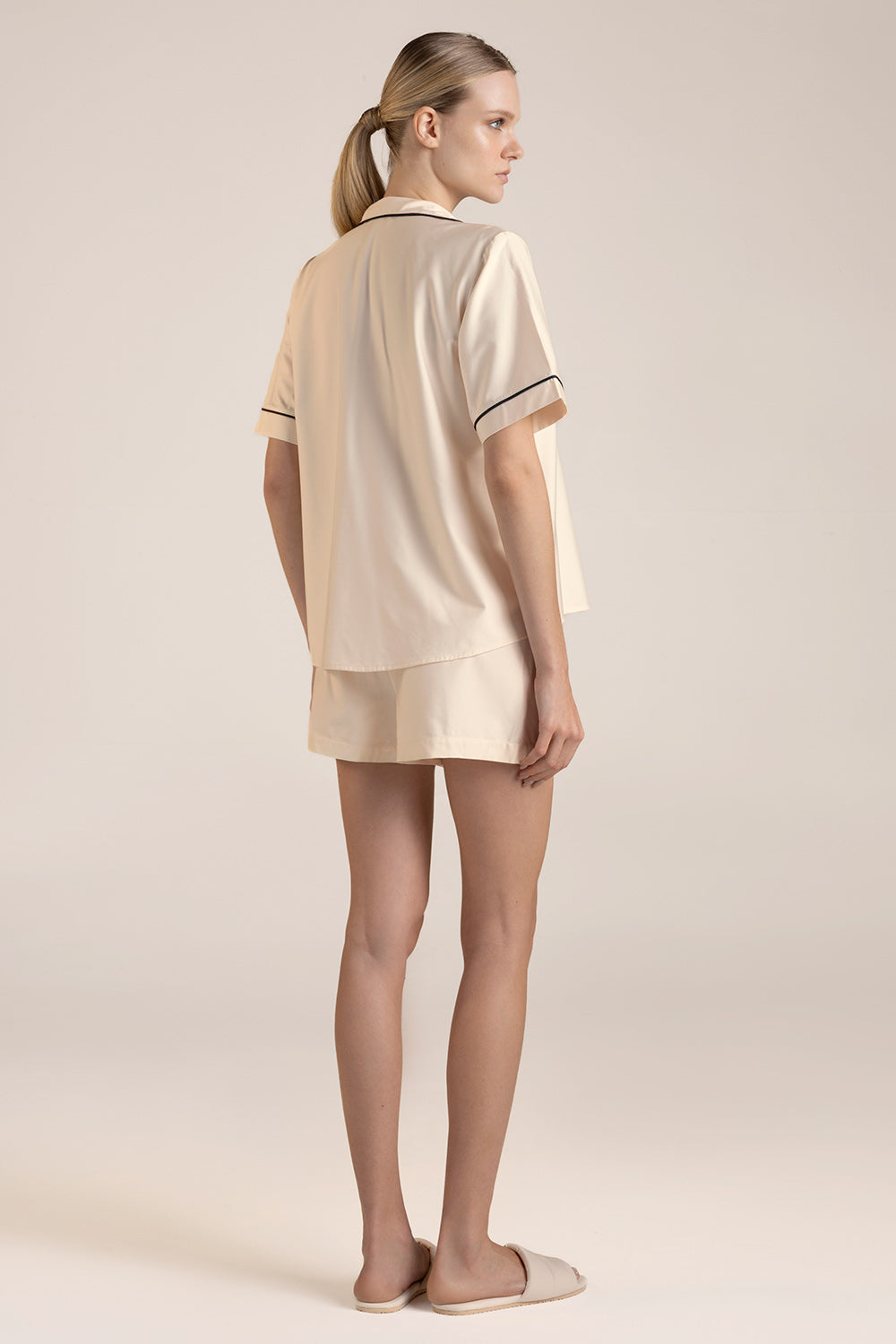 PRE-ORDER | Pijama short elaborada en viscosa elástica. camisa manga corta, cuello resort con perilla de botones, bolsillo de parche delantero y vivos en contraste. short clásico bota recta. Color Marfil, Ref. 0528M62