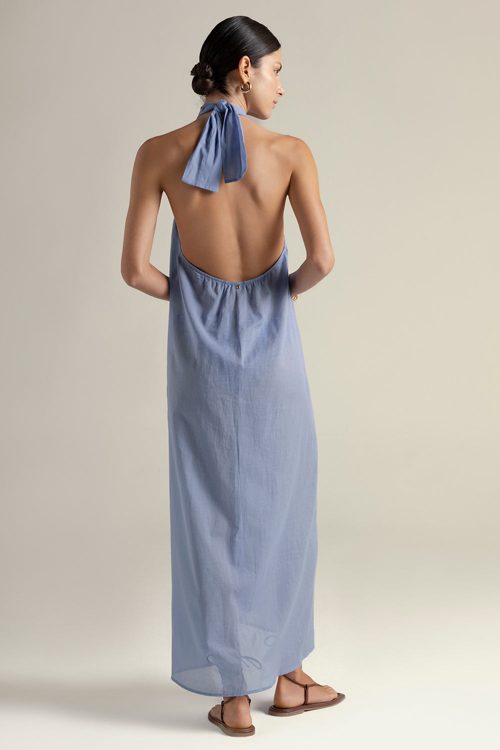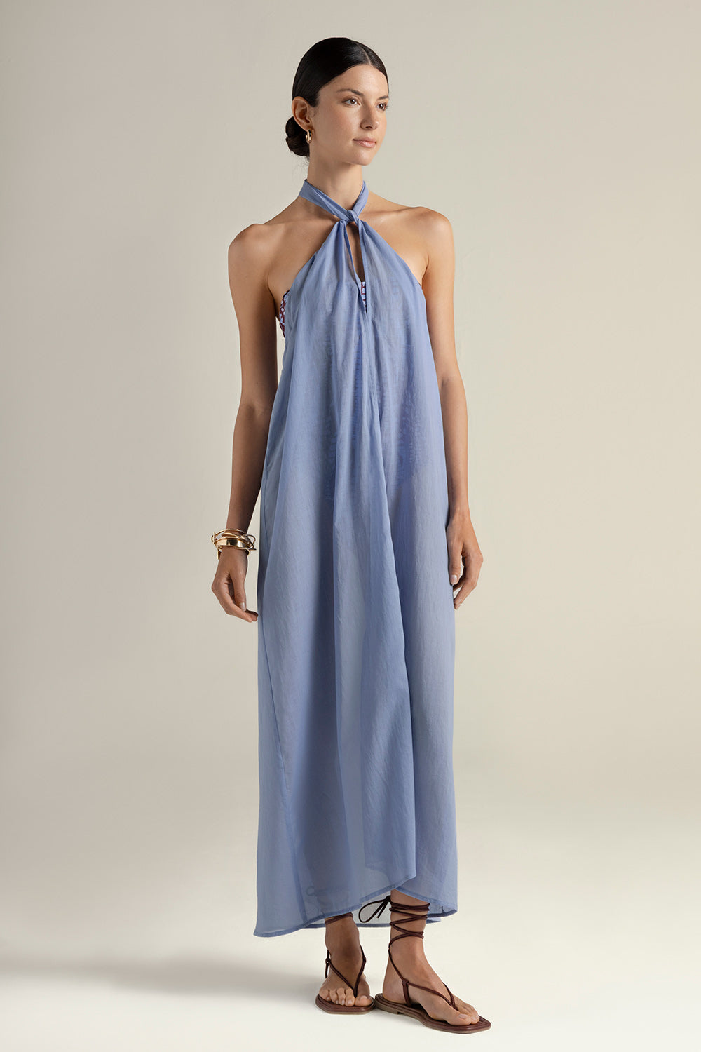 PRE-ORDER | Cover up largo en algodón 100%, color azul claro; cuello halter; abierto al frente y con escote profundo en la espalda; y detalle moneda con la “T” grabada en baño de oro, característico de nuestra marca.. Color azul claro, Ref. 0A67A61