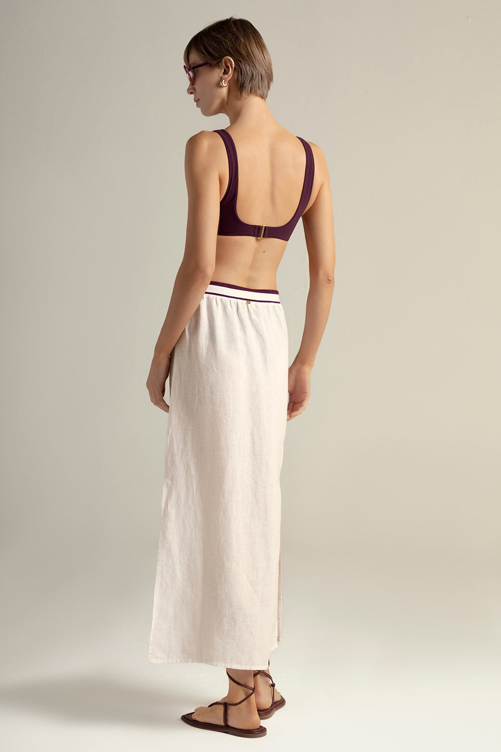PRE-ORDER | Falda larga en lino 100%, color blanco; cintura con elástico en rib color vino y blanco; detalle moneda con la “T” grabada en baño de oro, característico de nuestra marca.. Color blanco, Ref. 0F20B61