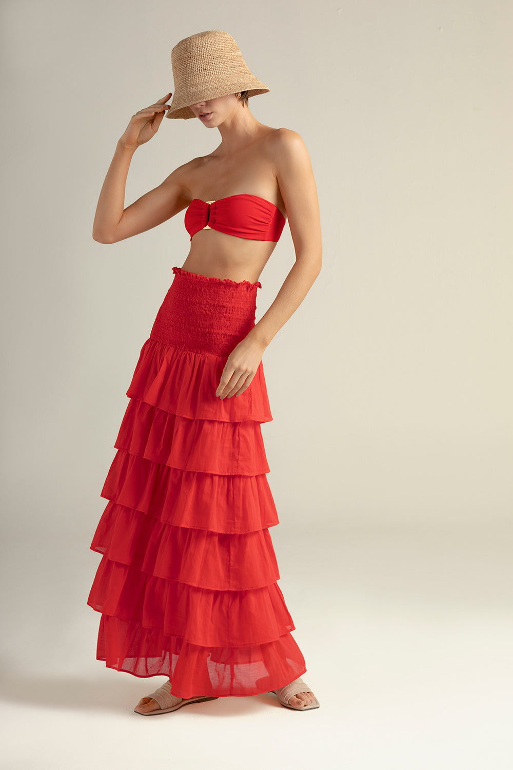 PRE-ORDER | Falda larga en algodón 100%, color rojo; cintura en nido de abeja y capas de boleros, también se puede usar como vestido; y detalle moneda con la “T” grabada en baño de oro, característico de nuestra marca. . Color rojo, Ref. 0F31R61