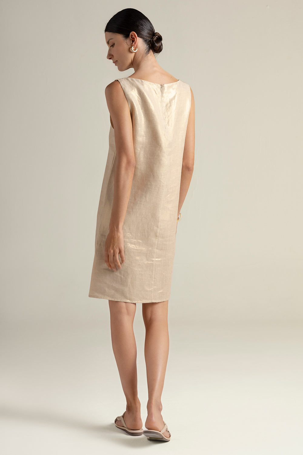 PRE-ORDER | Vestido corto en lino 100% con brillo dorado; con cuello redondo y manga sisa; forro interno; y cierre invisible en la espalda.. Color dorado, Ref. 0F16C61