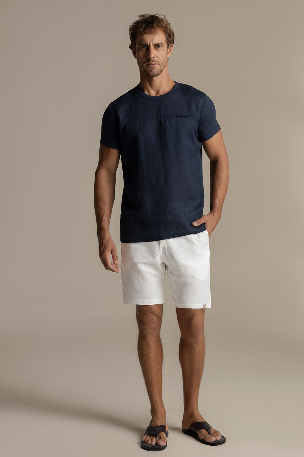 Camiseta jamaica con frente en lino, espalda y mangas en algodón, manga corta y bolsillo de ribete en frente. Color Azul Ref. SH06D21