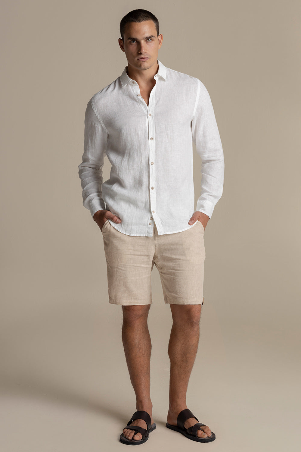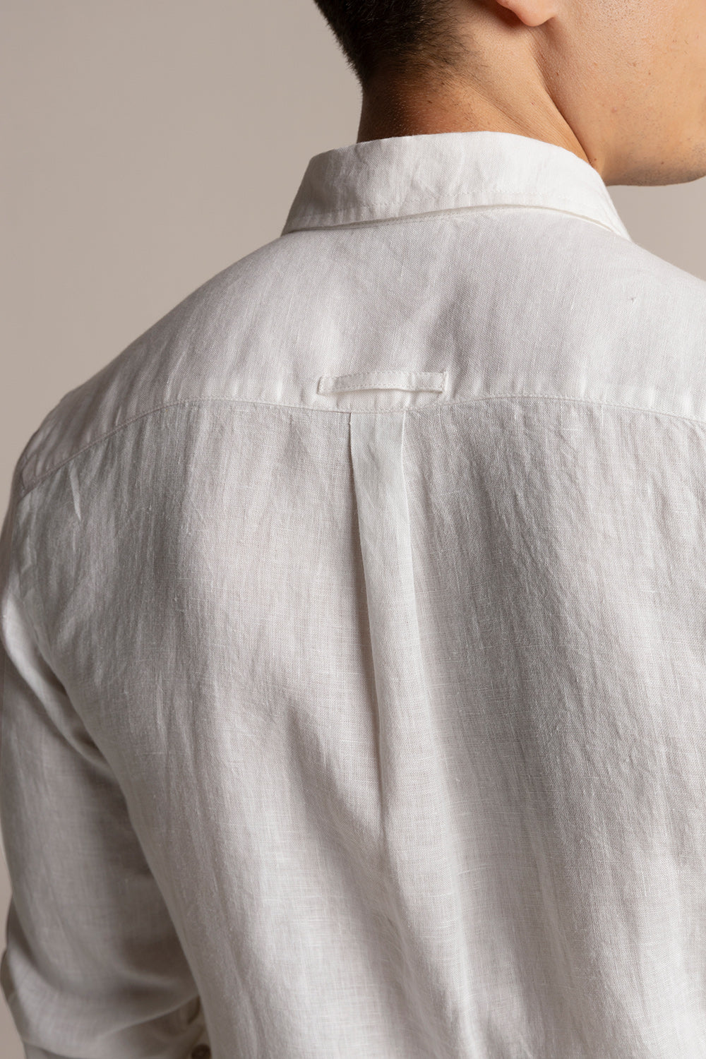 Camisa bora bora en lino, manga larga, silueta clásica, cuello clásico con tablas en espalda. Color Blanco Ref. SH07001