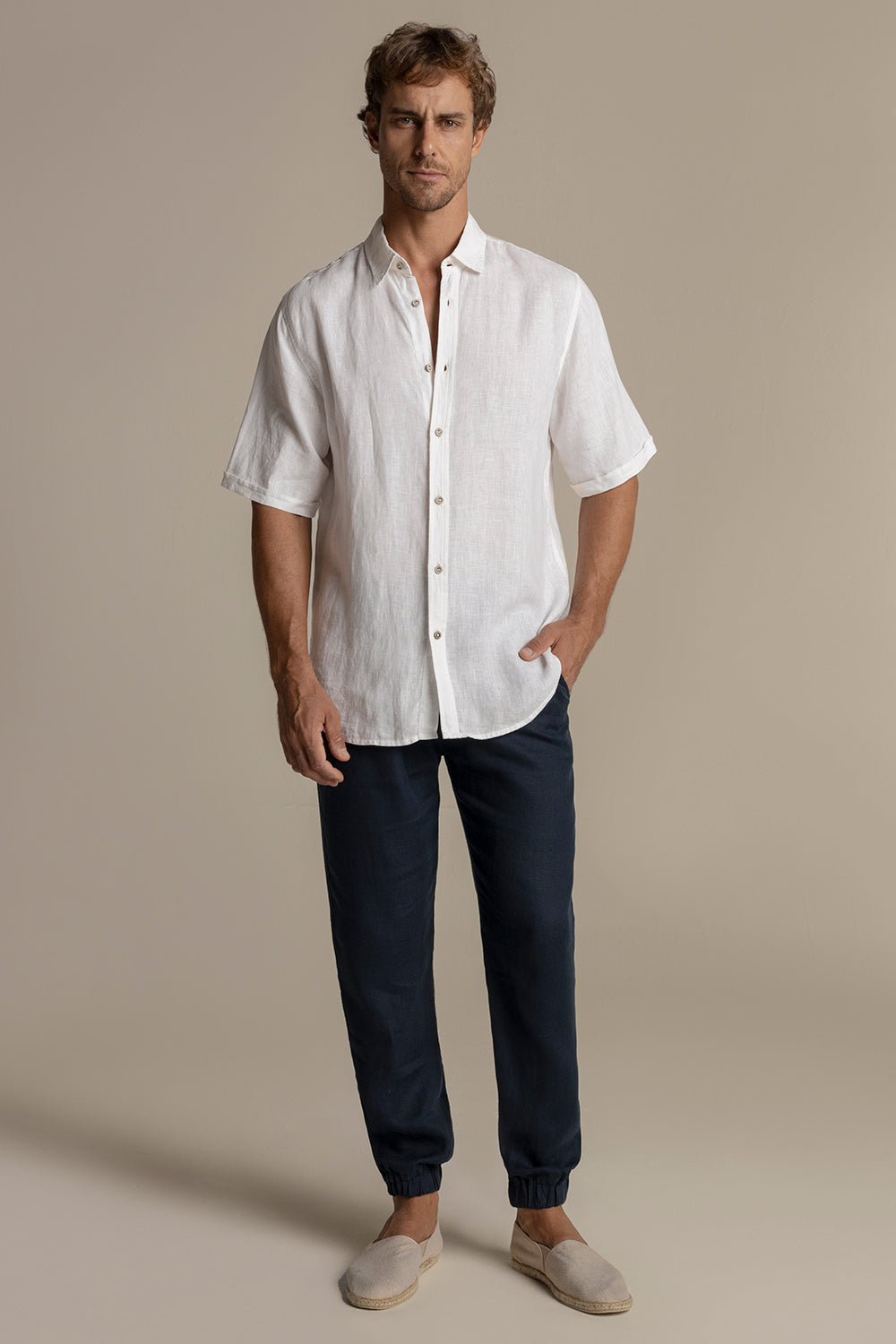 Camisa bali en lino, manga corta, silueta clásica, con tablas en espalda y cuello clásico. Color Blanco Ref. SH86041