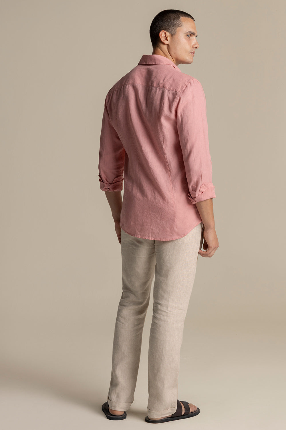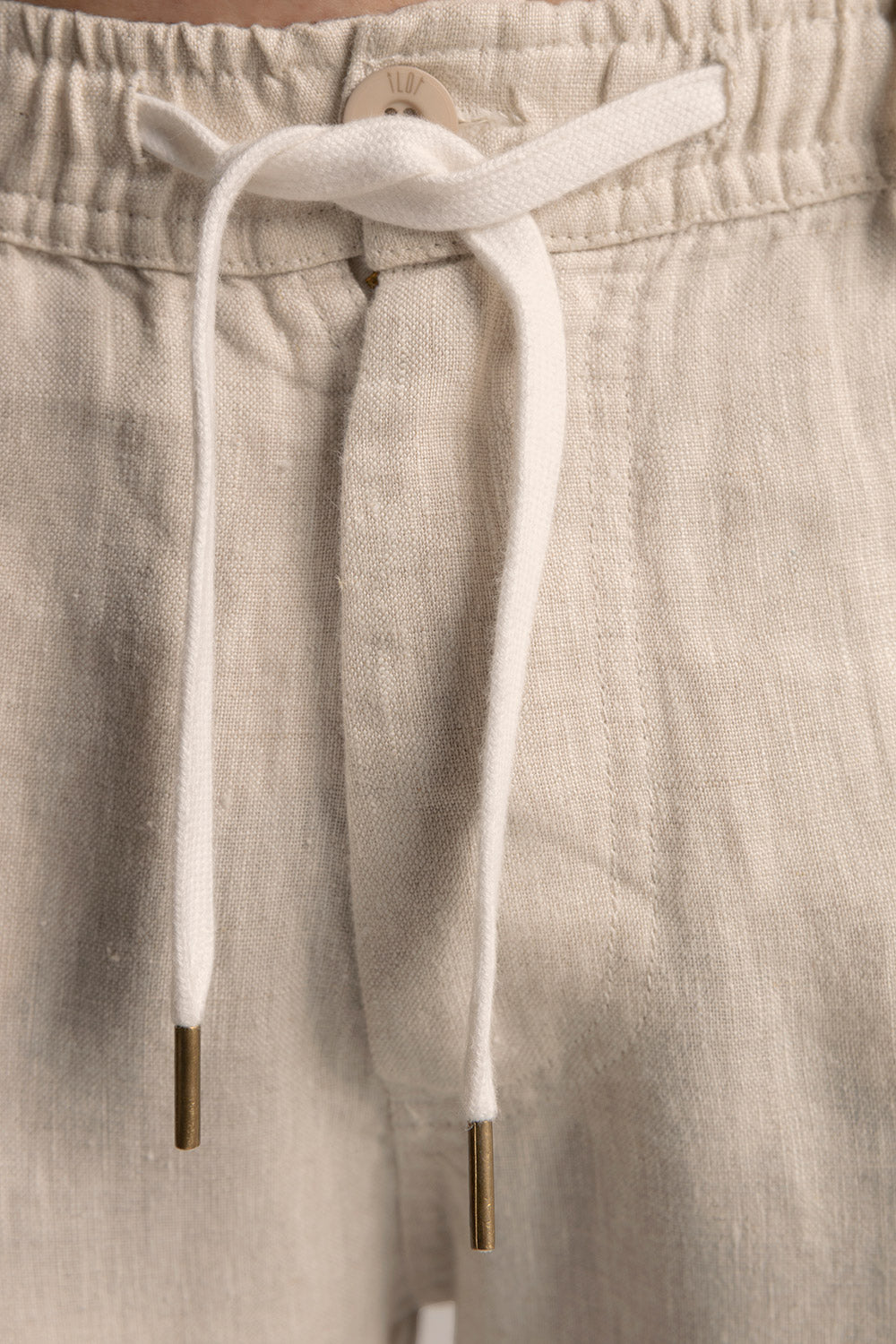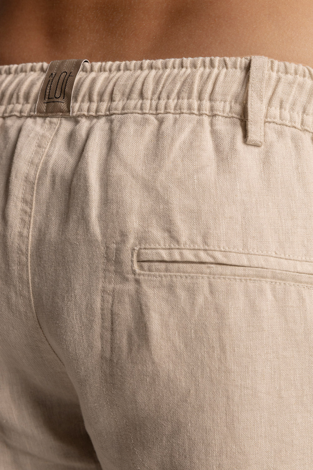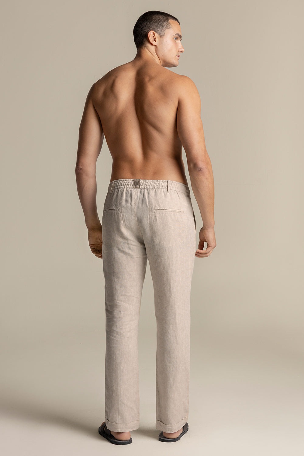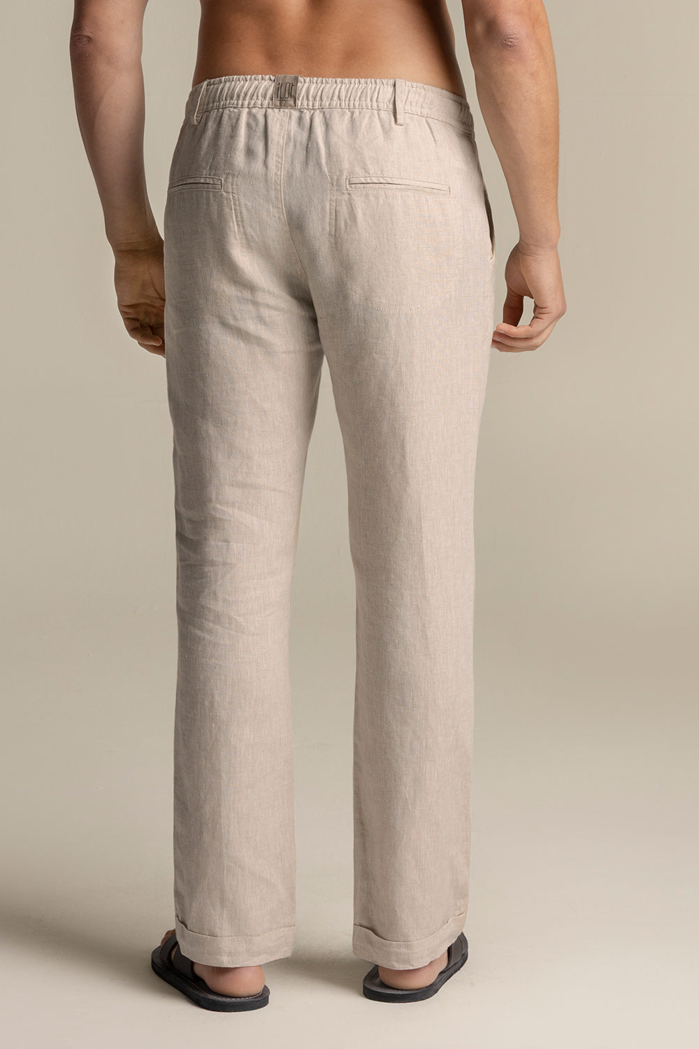 Pantalón cabo en lino, silueta clásica, cintura enresortada, pasadores, botón para ajuste en cintura, bolsillos laterales, bolsillos de parche traseros y guardapolvo en bota. Color Caqui Ref. PH02K91
