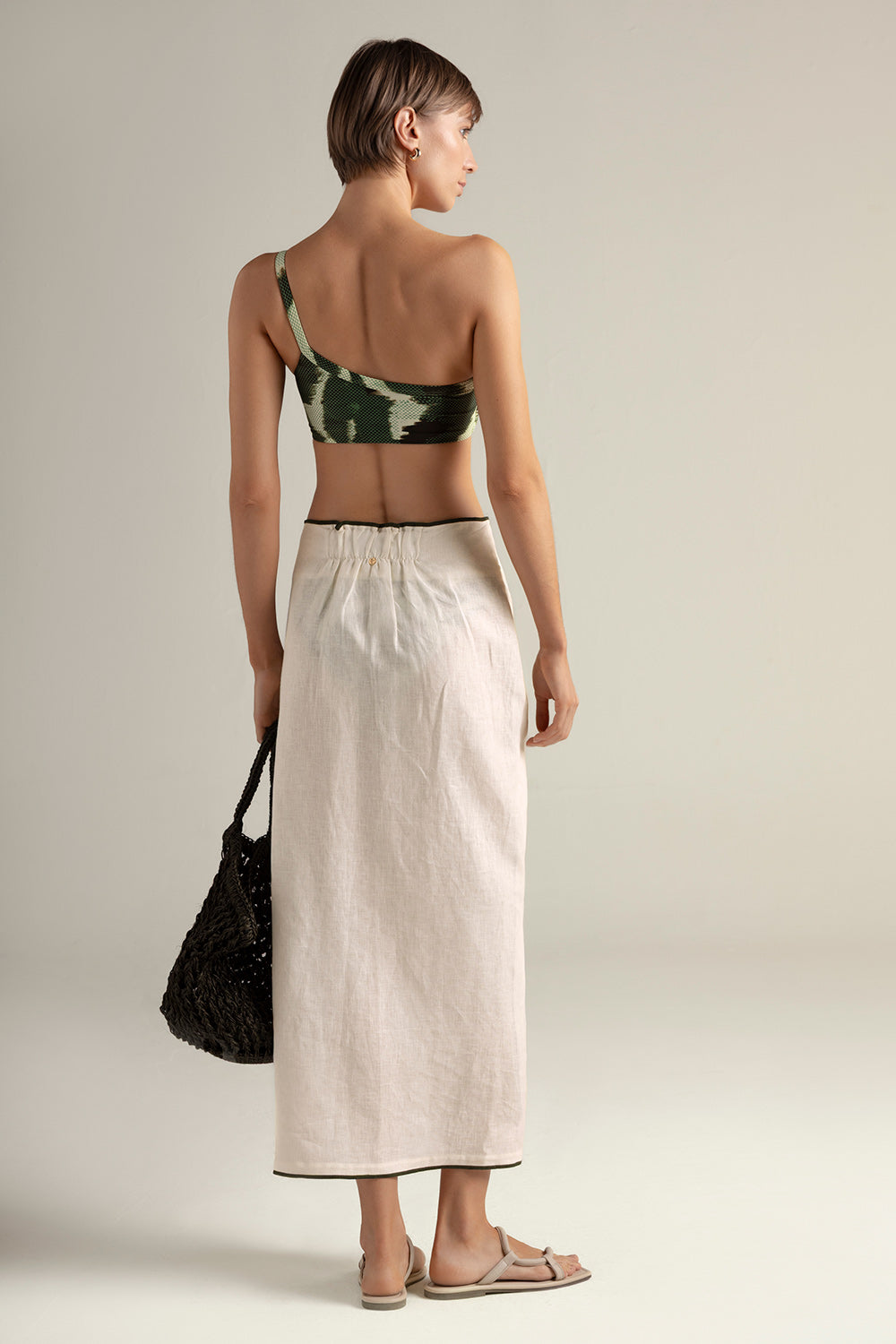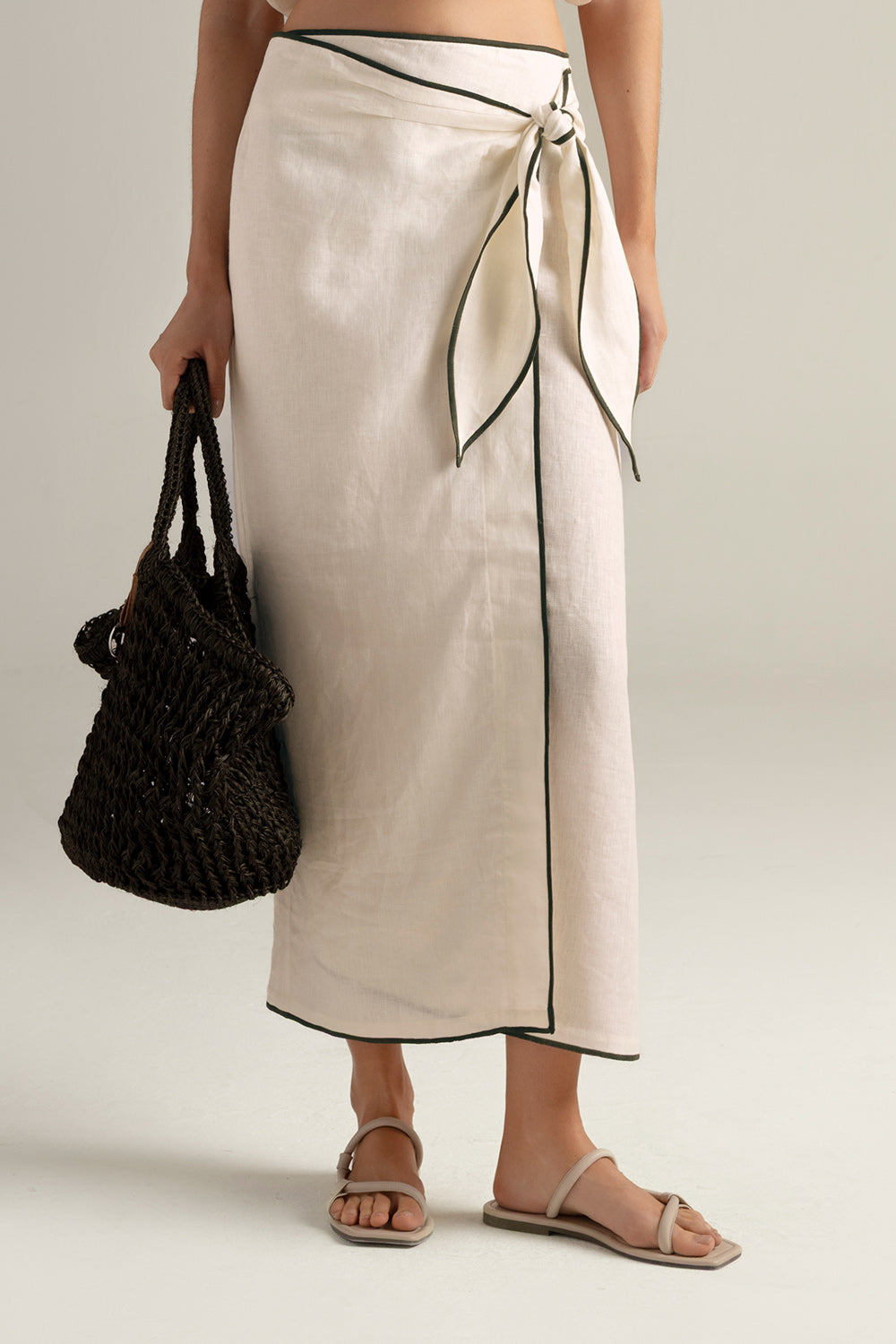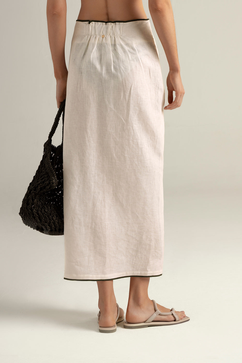 PRE-ORDER | Falda pareo larga en lino 100 % color crema; con costuras filete expuestas en color verde; cruzado en frente con botones internos y tiras laterales para un mejor ajuste y un fit personalizado. Largo midi; detalle moneda con la "T" grabada en baño de oro, característico de nuestra marca. . Color crema, Ref. 0F39C61