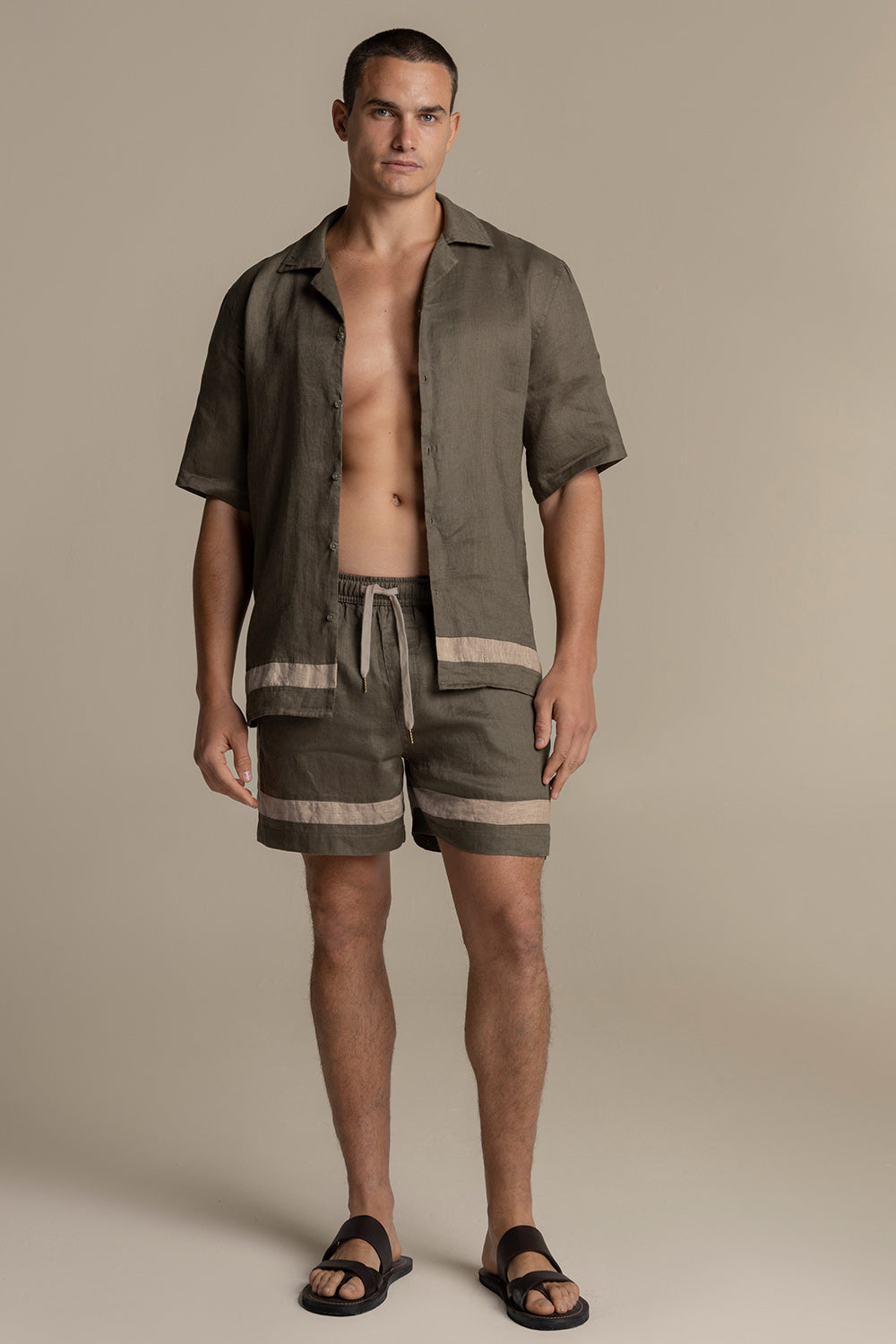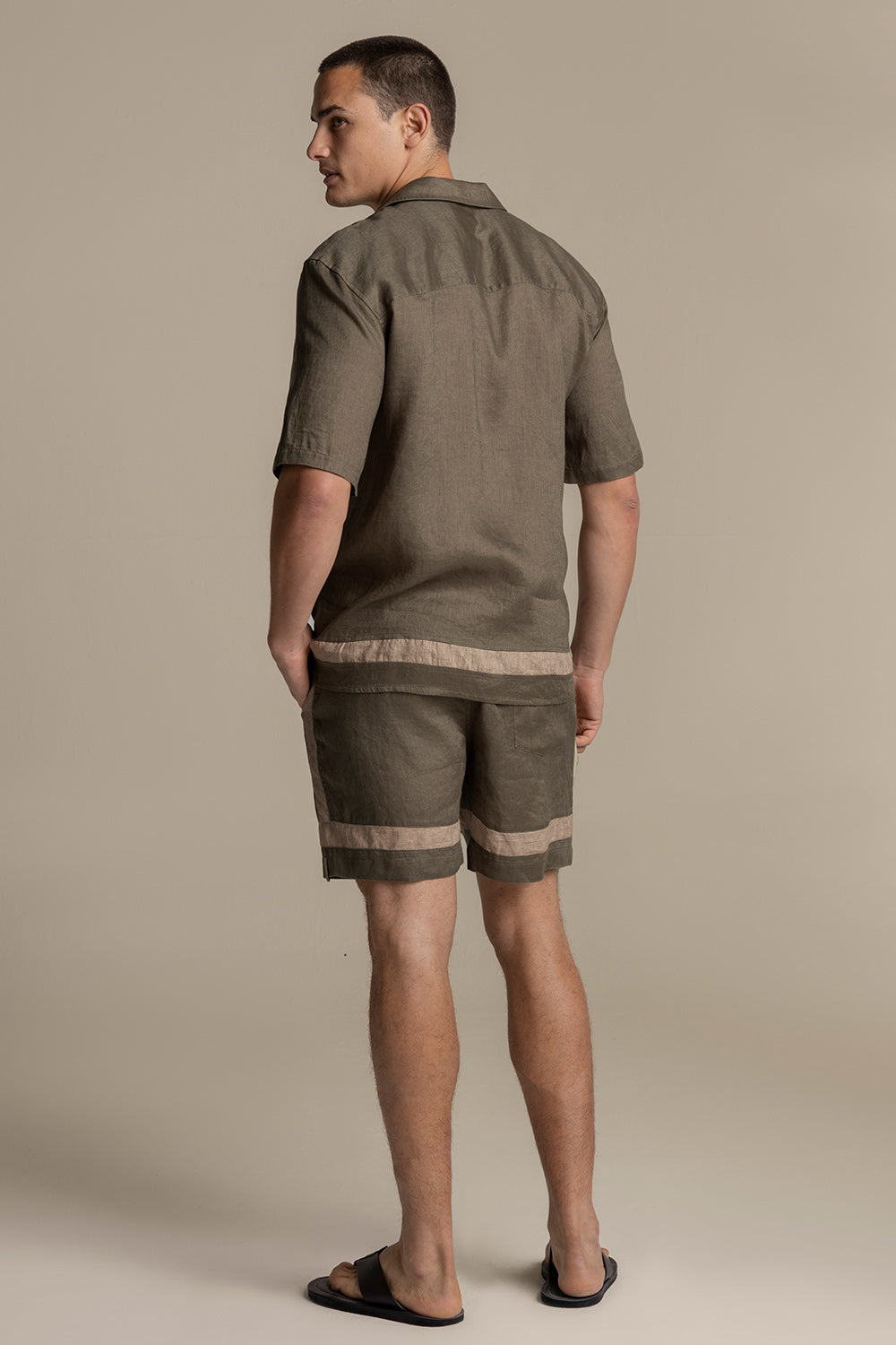 PRE-ORDER | Camisa Ibiza en lino, bloques en verde militar y arena. Manga corta, relaxed fit y cuello bowling. Color verde/arena, Ref. SH45V61