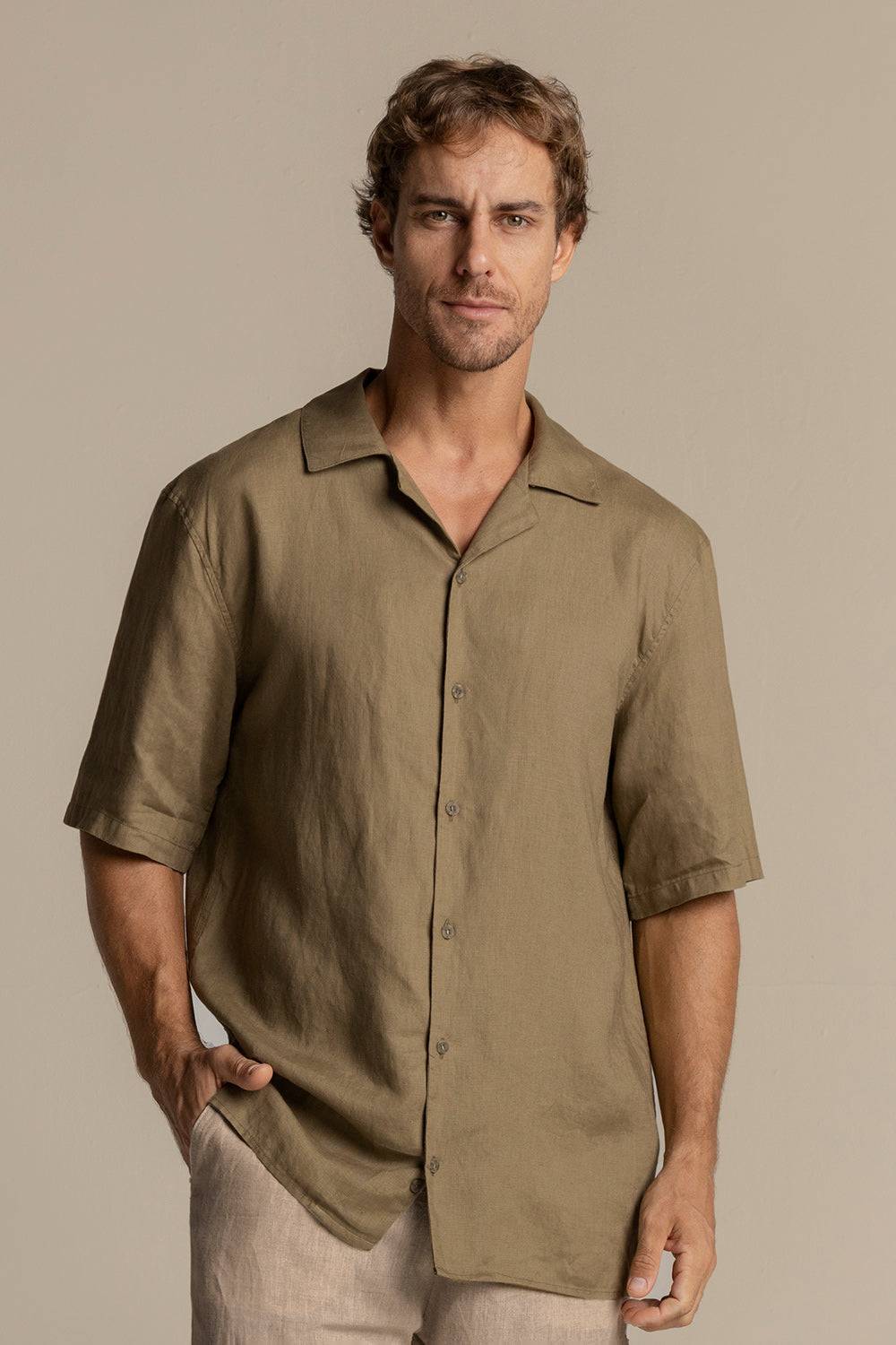 PRE-ORDER | Camisa Ibiza en lino verde oliva. Manga corta, relaxed fit y cuello bowling. Color verde oliva, Ref. SH56V61