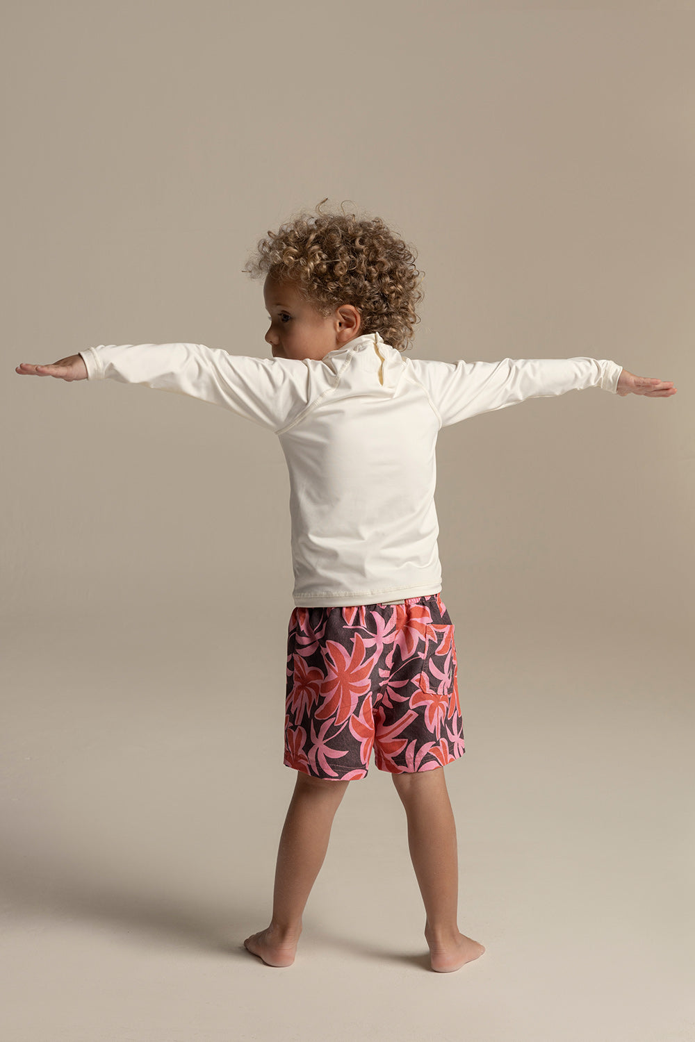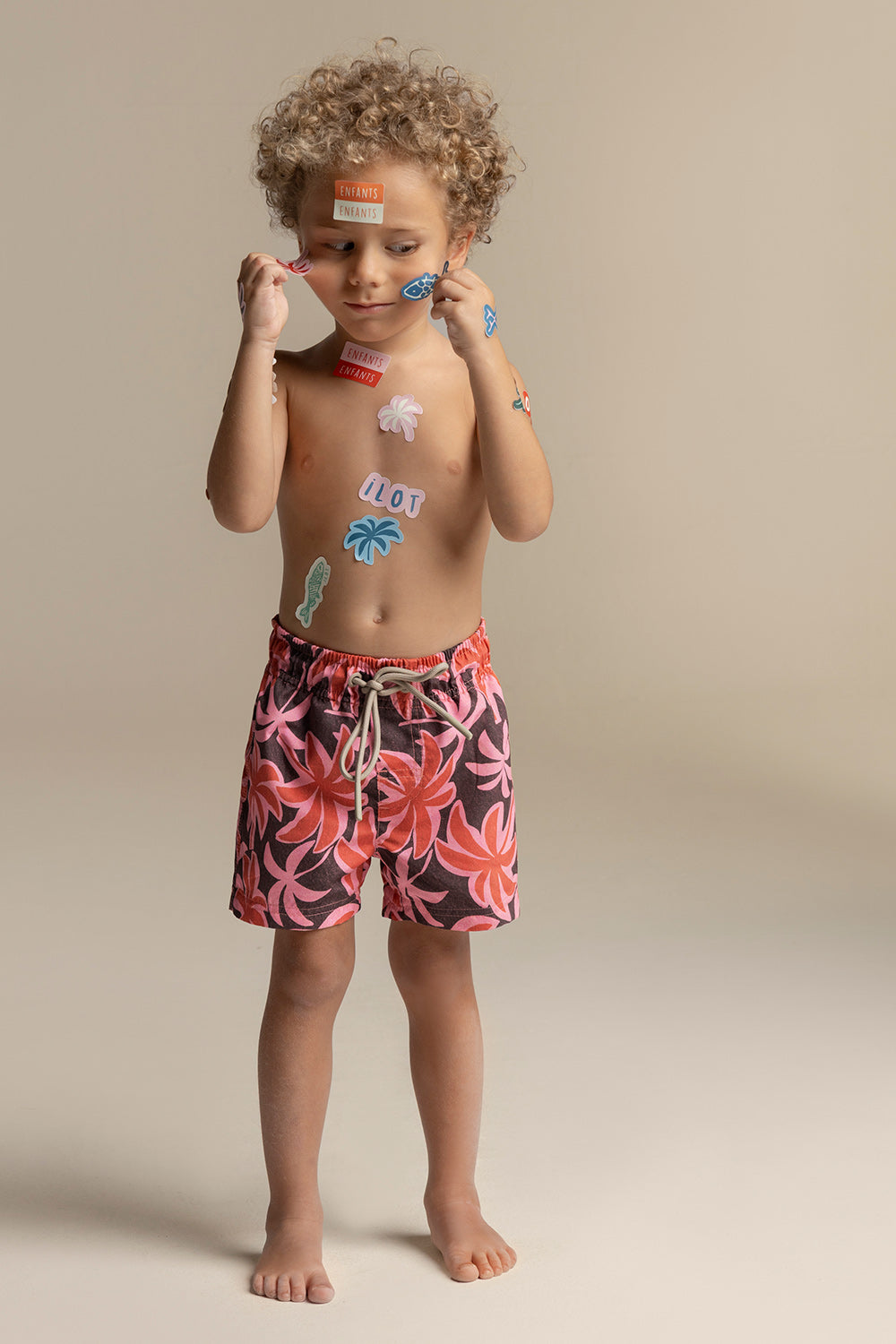 PRE-ORDER | Pantaloneta Kids, estampado de palmeras rosadas. Silueta clásica con elástico en la cintura y cordón pardo con punteras de caucho. Ojaletes en pardo mate y bolsillo de parche. Color multicolor, Ref. KH32061