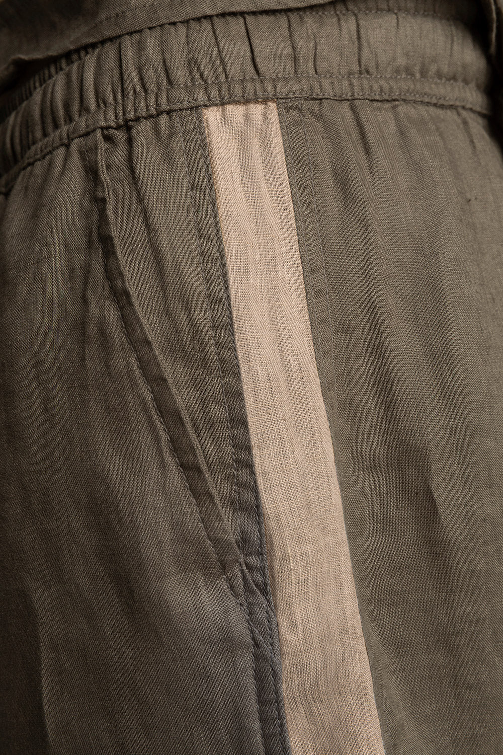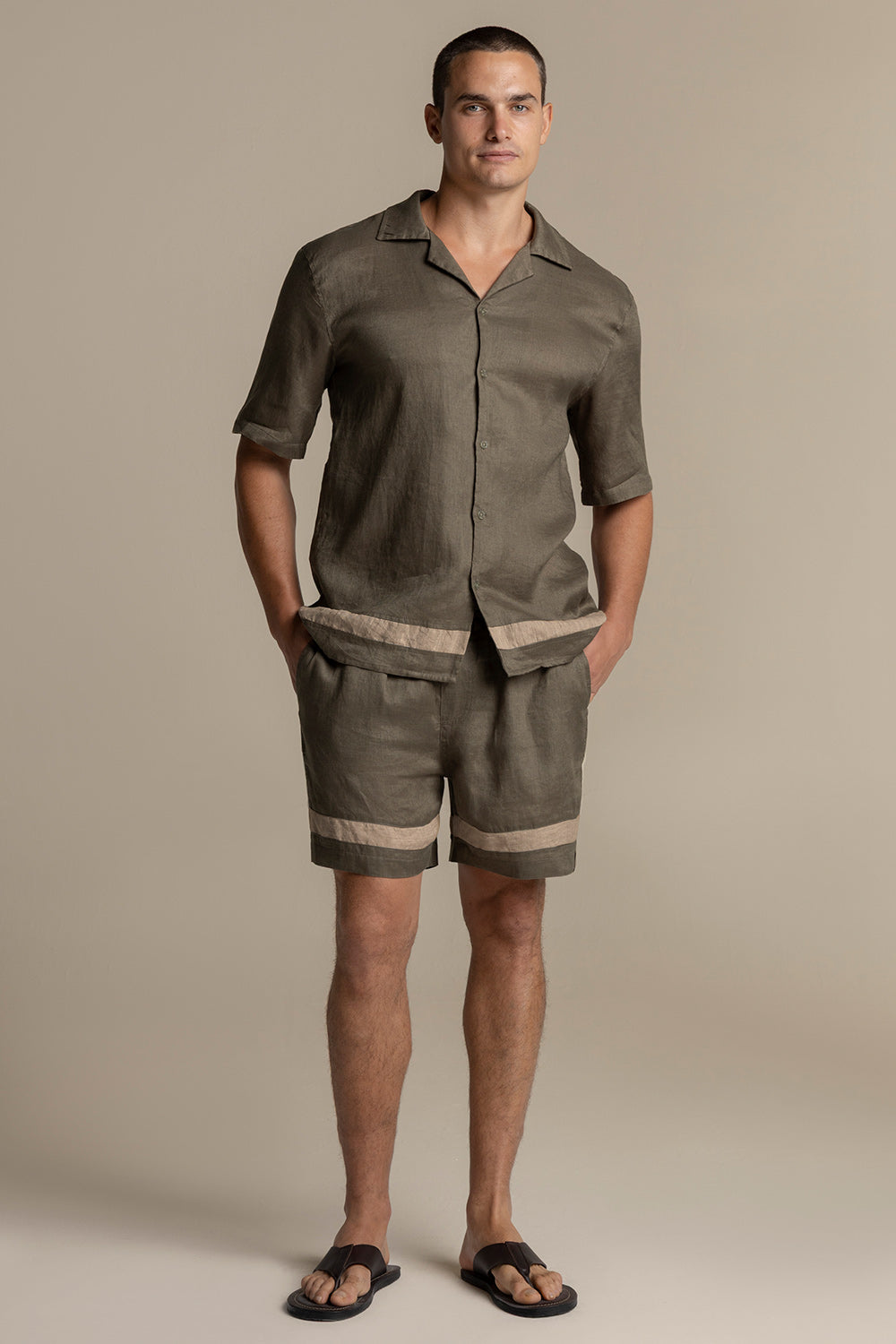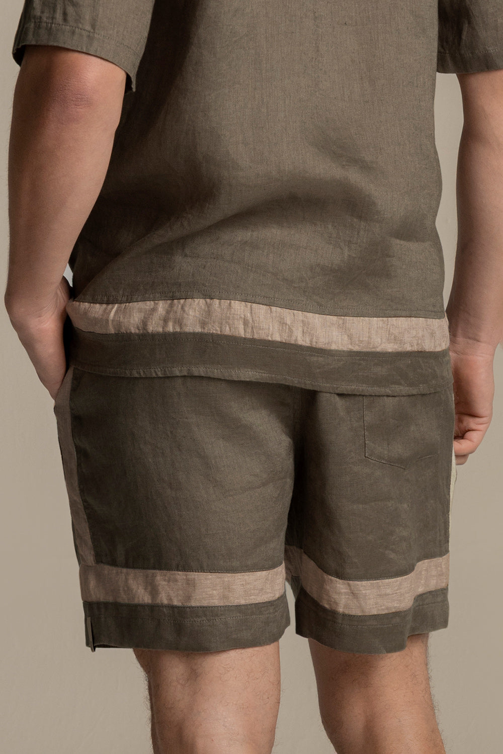 PRE-ORDER | Short Faro en lino, bloques en verde militar y arena. Relaxed fit, bolsillos laterales, cintura enresortada con cordón y bolsillo posterior de parche. Color verde/arena, Ref. BH61V61