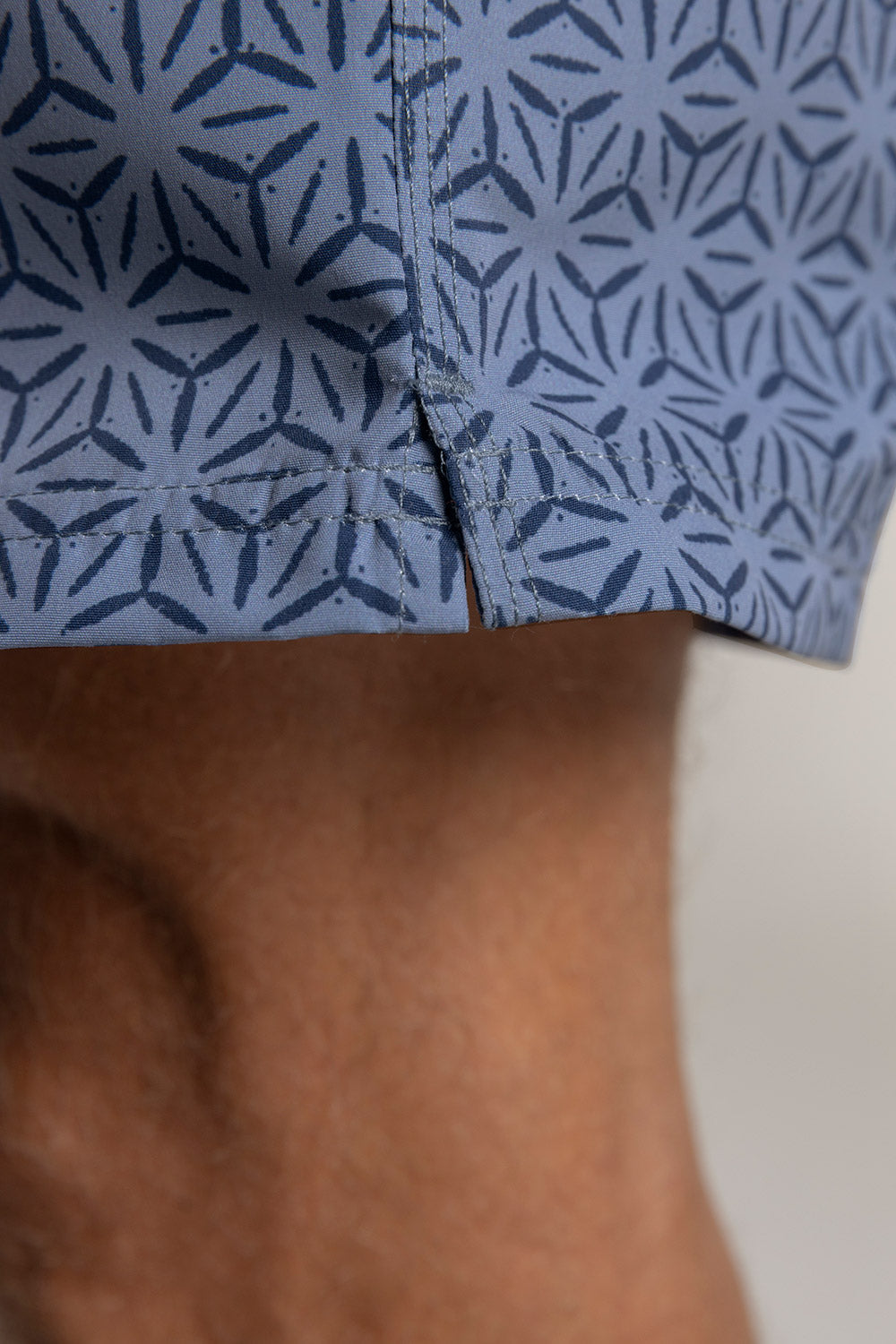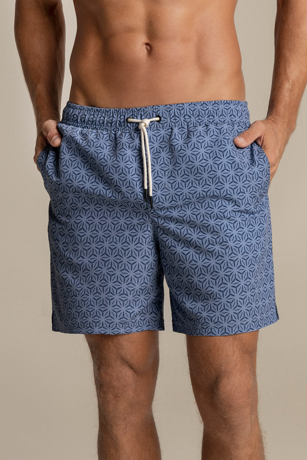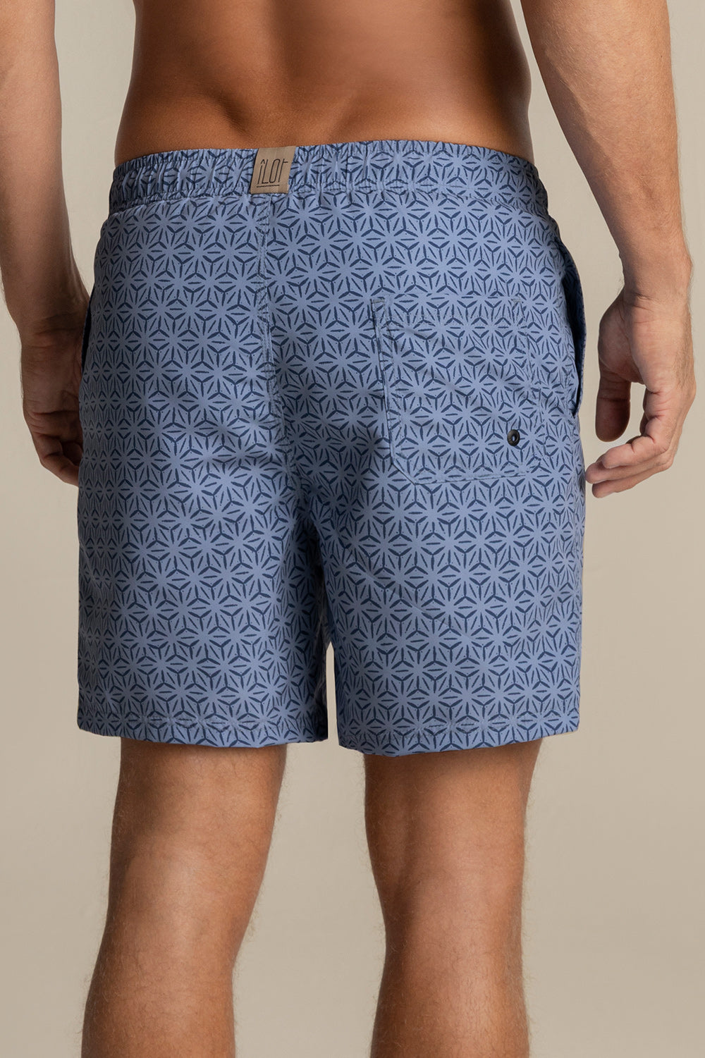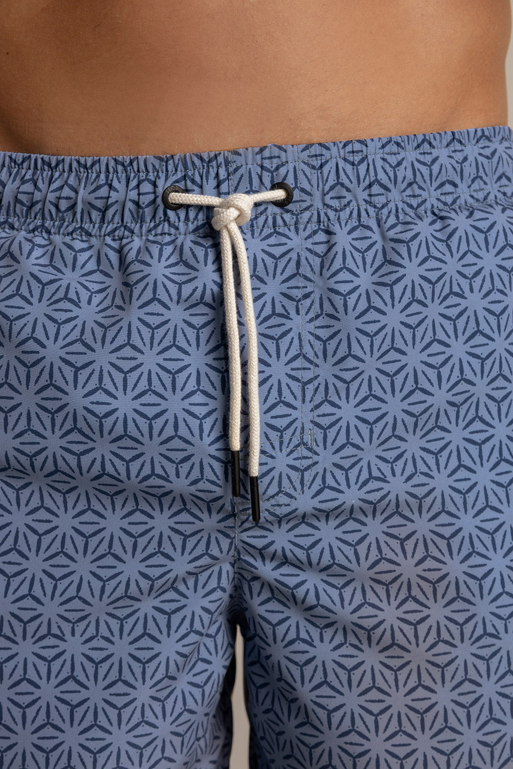 PRE-ORDER | Pantaloneta Bahía corta, estampado geométrico azul. Silueta clásica con elástico en la cintura y cordón off white con punteras metálicas en negro mate. Ojaletes en negro mate y bolsillo de parche. Color azul claro, Ref. CH25061-MH25061
