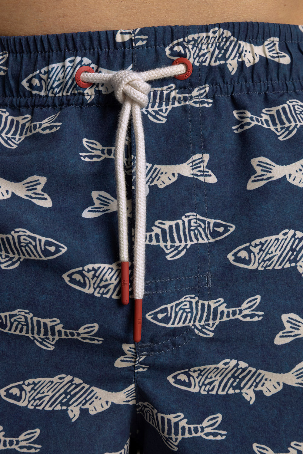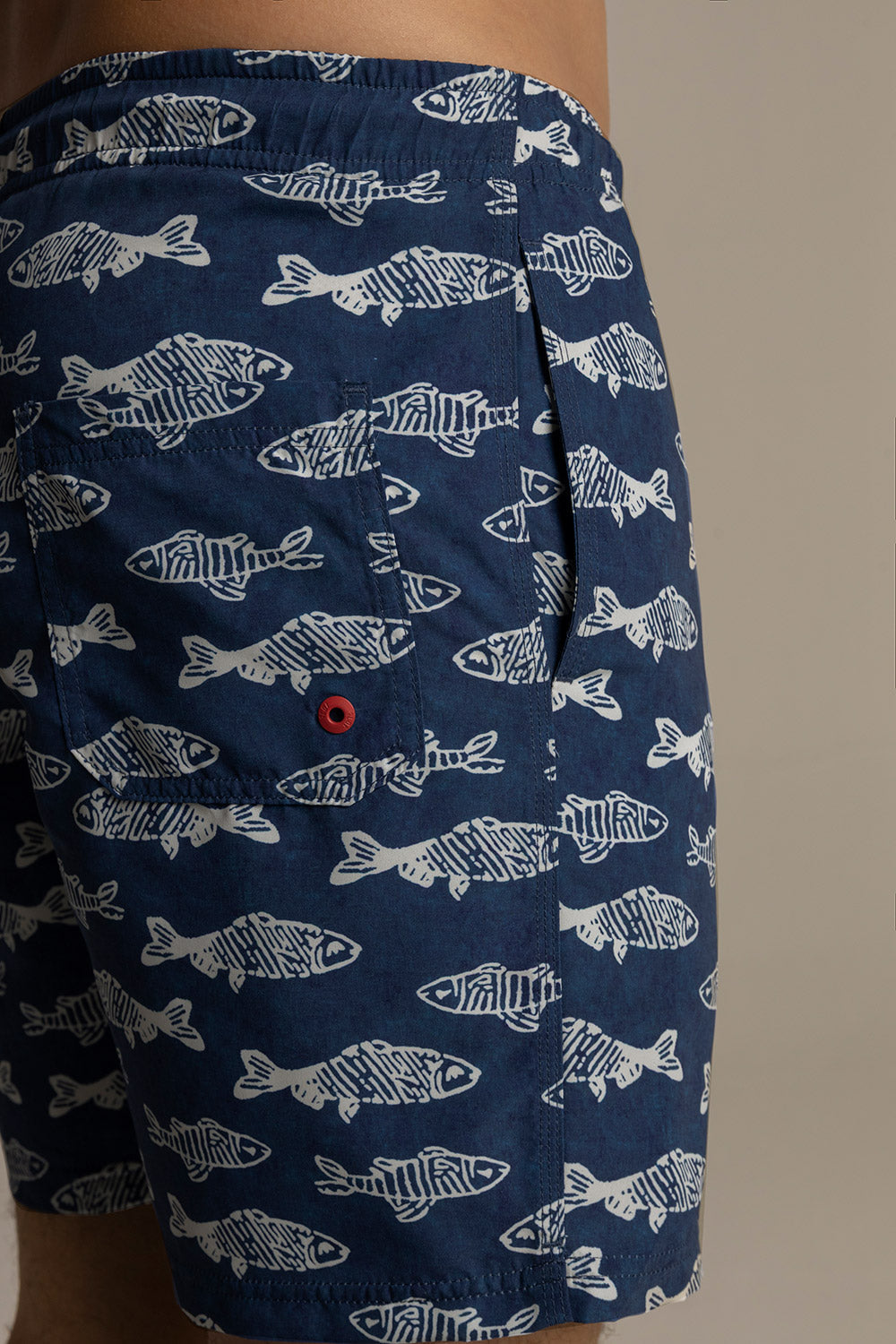 PRE-ORDER | Pantaloneta Bahía corta, estampado de peces azul y marfil. Silueta clásica con elástico en la cintura y cordón off white con punteras metálicas en rojo. Ojaletes en rojo mate de zamak y bolsillo de parche. Color azul/marfil, Ref. CH28061-MH28061-LH28061
