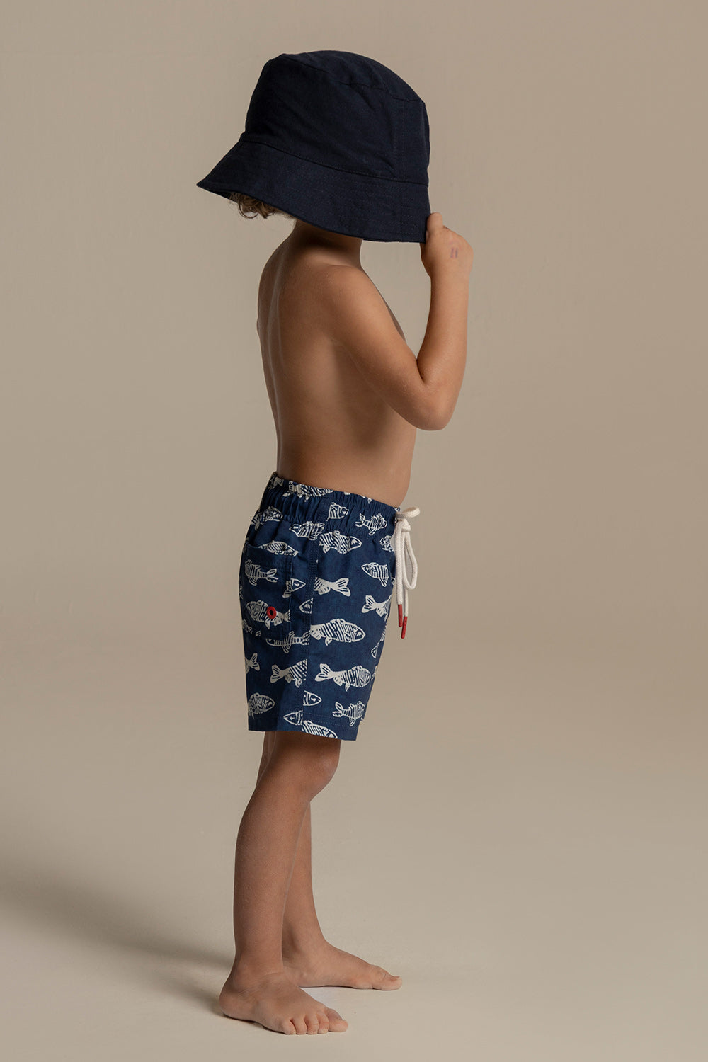 PRE-ORDER | Pantaloneta Kids, estampado de peces azul y marfil. Silueta clásica con elástico en la cintura y cordón off white con punteras metálicas en rojo. Ojaletes en rojo mate y bolsillo de parche. Color azul/marfil, Ref. KH28061
