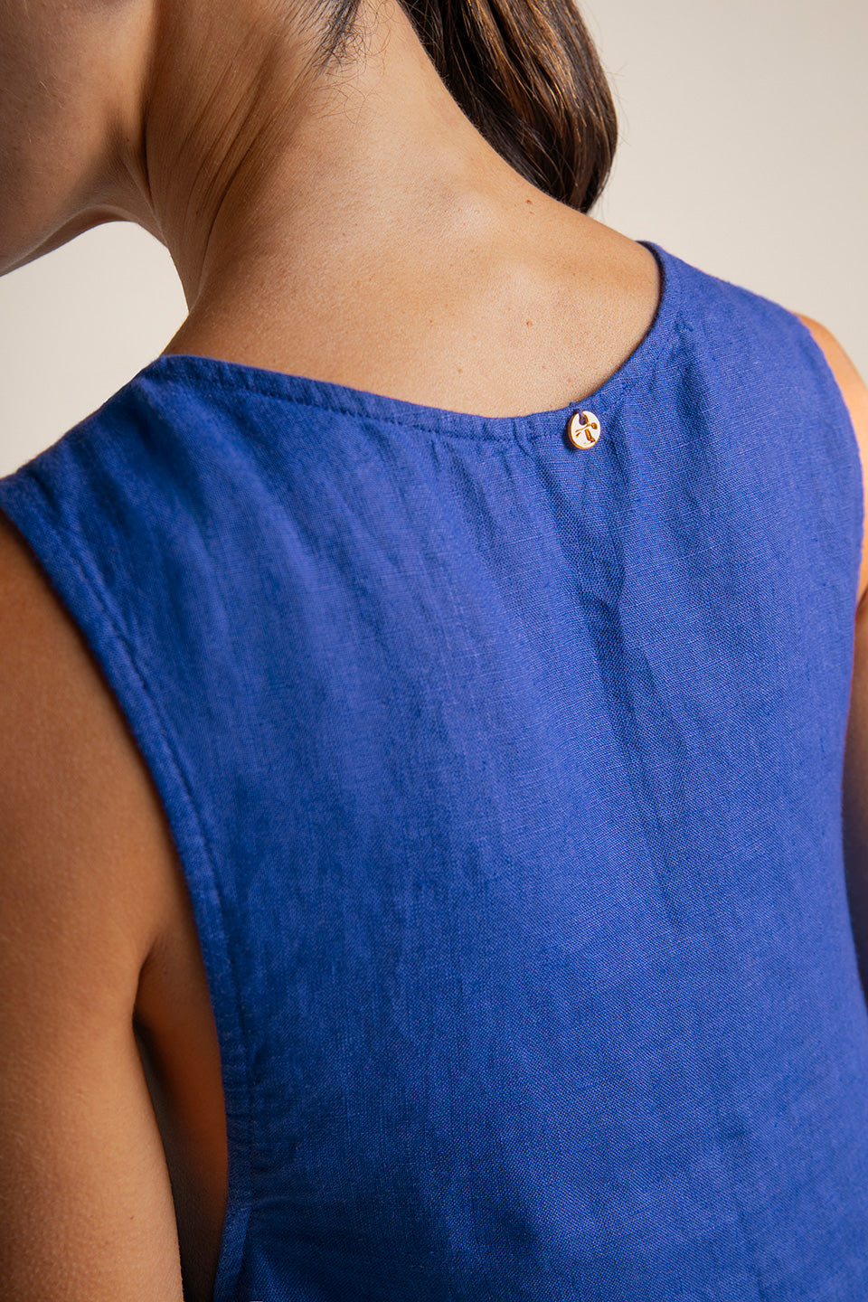 Vestido corto en lino; cuello redondo; sin mangas; aberturas laterales inferiores; ruedo curvo y moneda en baño de oro grabada con la ''t'', como detalle distintivo de la marca. Color azul rey, Ref. 0F55A62